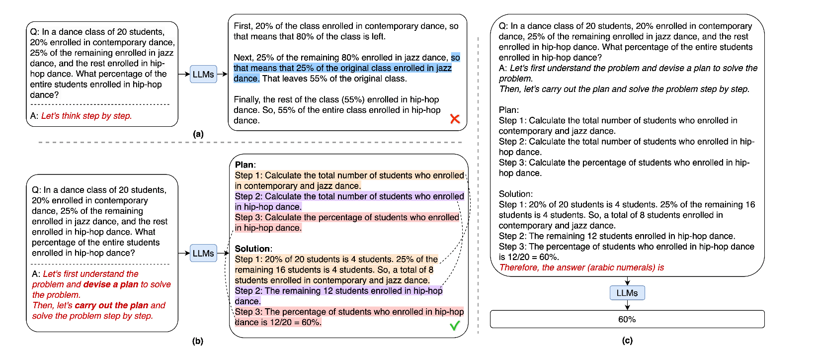 This is a two step process which guides the LLM to pay more attention to calculation and intermediate results to ensure that they are correctly performed as much as possible.