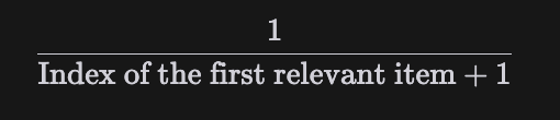 Obviously if we're suggesting songs to the user, we want the first relevant song to be listed as early as possible! Therefore we'd prefer 1 over 2 in the example above because 2 is ordered earlier in the first case. A metric that works well for this is the Reciprocal Rank (RR).
